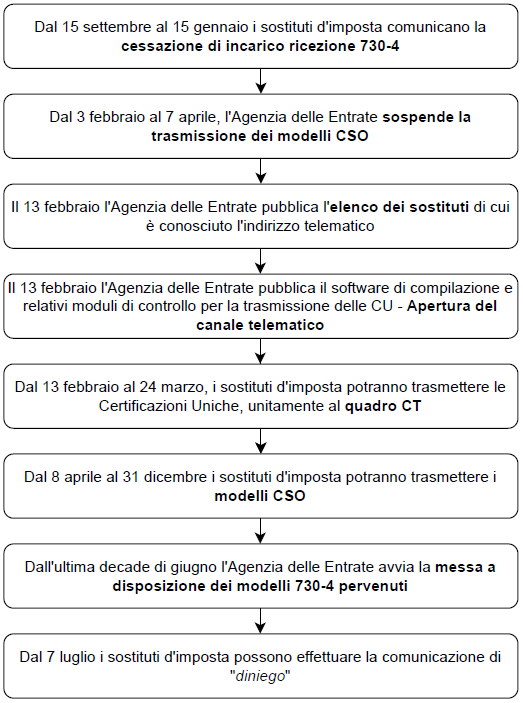 Al riguardo si evidenzia che – teoricamente – la prima data utile per l’avvio della presentazione del modello 730 coincide con il giorno successivo alla scadenza per la trasmissione delle Certificazione Uniche. Pertanto, nel caso in cui il rapporto di lavoro sia cessato successivamente alla scadenza di invio delle Certificazioni Uniche ma precedentemente alla data di ricezione del prospetto 730-4: