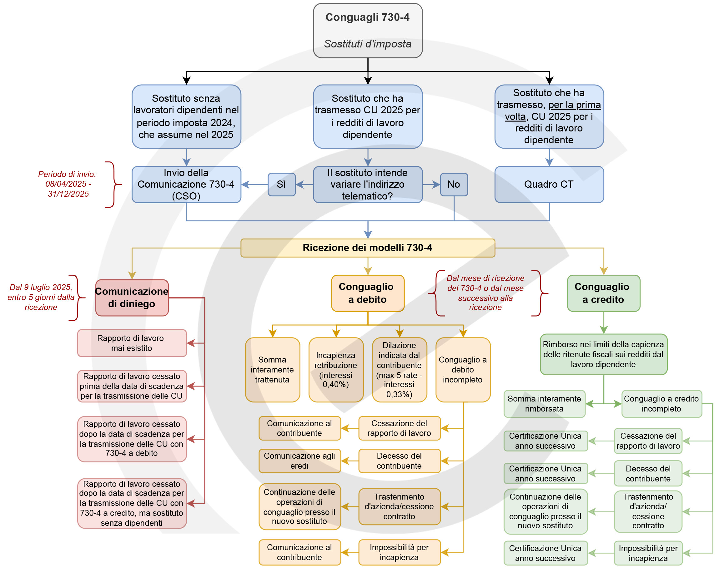 Dall’ultima decade di giugno, l’Agenzia delle Entrate mette a disposizione dei sostituti d’imposta, che hanno compilato il quadro CT del modello di Certificazione Unica ovvero che hanno inviato il modello CSO, le risultanze delle imposte dovute dai sostituiti, chiamandoli a rimborsare o trattenere rispettivamente i crediti e/o i debiti dettagliatamente riportati nel modello c.d. 730-4, nella prima retribuzione utile e comunque sulla retribuzione di competenza del mese successivo a quello in cui il sostituto ha ricevuto il prospetto di liquidazione.