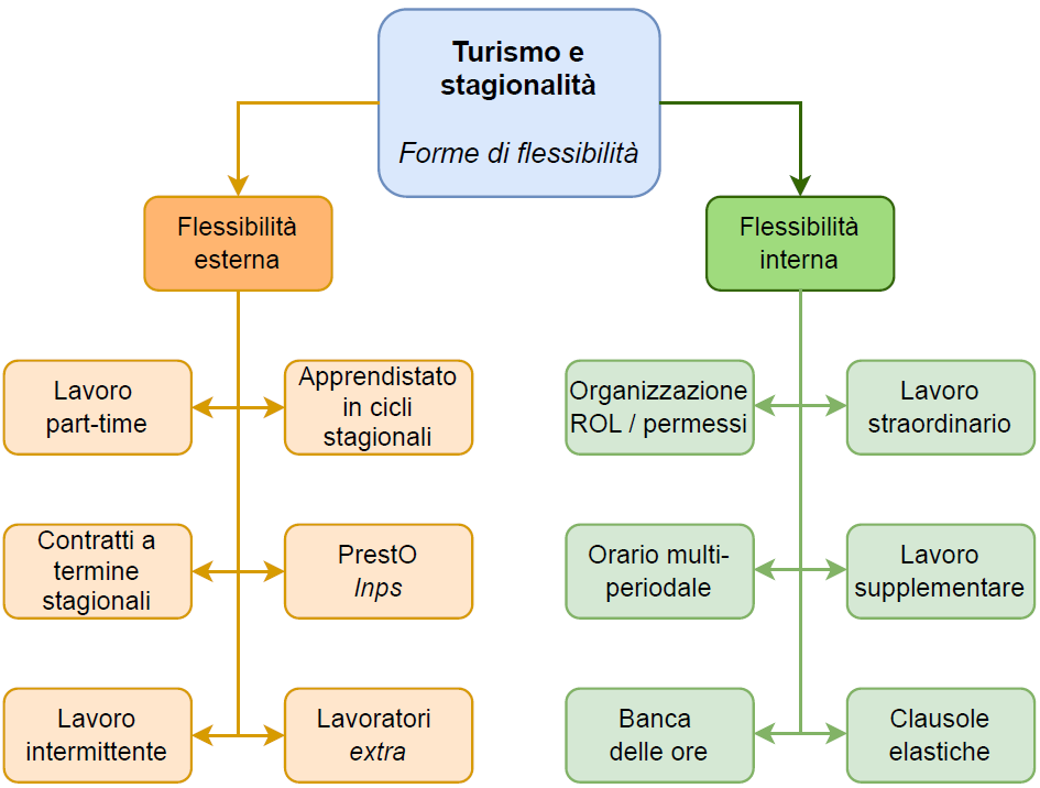 Oltre al tema dei contratti a tempo determinato stagionali, la gestione e l’organizzazione del personale dipendente nelle attività stagionali passa necessariamente da ulteriori strumenti di flessibilità, sia esterna (variazioni in aumento o in diminuzione dell’organico), che interna (azione sul numero di ore lavorabili o distribuzione oraria), sia legali che contrattuali, che riescono a soddisfare le imprescindibili necessità dell’intero comparto turistico del Belpaese.