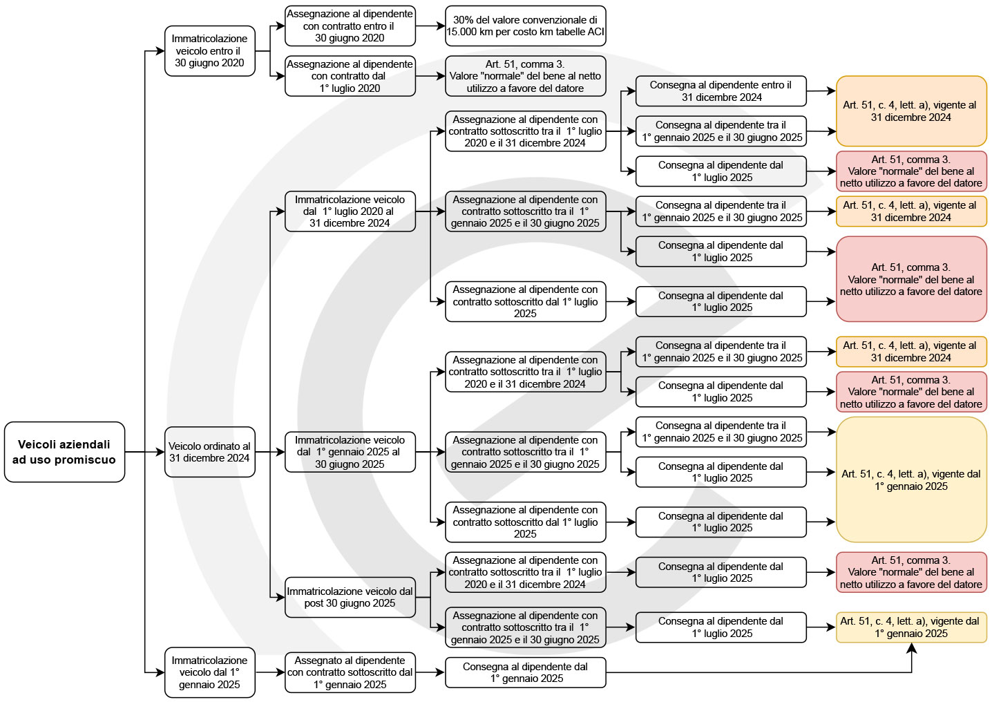 - per i veicoli consegnati ad uso promiscuo ai dipendenti dal 1° luglio 2020 al 31 dicembre 2024, sempreché immatricolati e “contrattualizzati” dal 1° luglio 2020, continuerà ad applicarsi la disciplina prevista dall’art. 51, comma 4, lett. a), nella versione ante modifica intervenuta con la legge di Bilancio 2025;