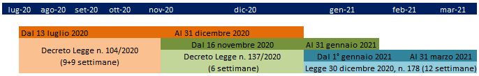 Ulteriori dodici settimane di integrazione salariale Covid a partire dal 1° gennaio 2021. La novità, contenuta nell'art. 1, comma 300, della legge di bilancio per l'anno 2021, riconosce il predetto periodo di dodici settimane ai datori di lavoro che sospendono o riducono l'attività lavorativa per eventi riconducibili all'emergenza epidemiologica da Covid-19. Doppio binario per l'arco temporale di settimane concedibili: sino al 31 marzo 2021 per le imprese che ricorrono alla cassa integrazione ordinaria; sino al 30 giugno 2021 per assegno ordinario o cassa integrazione in deroga.