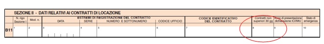 Nella sezione II vi è la Colonna 8 (Contratti non superiori 30 gg) che va barrata nel caso di contratto di locazione non registrato di durata non superiore a trenta giorni complessivi nell’anno. Se è barrata questa casella, non vanno compilate né le colonne da 3 a 6 relative agli estremi di registrazione del contratto, né la colonna 7 relativa al codice identificativo del contratto.